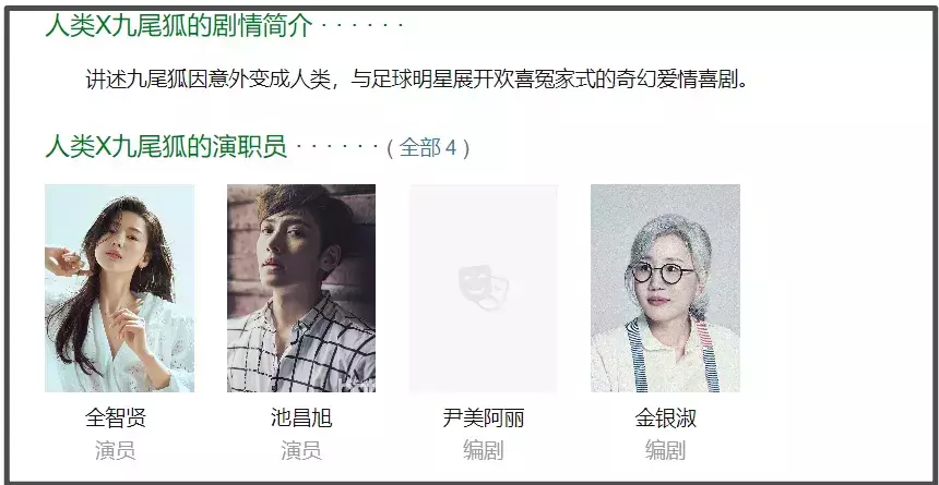 至于《人类X九尾狐》,则是一部爱情偶像剧,讲述的是九尾狐因意外变成人类,与足球明星成为欢喜冤家的故事,整部剧还埋了一个暗雷,那就是剧本看似由韩国名编剧金银淑操刀,实际上是编剧助理尹美阿丽代笔。