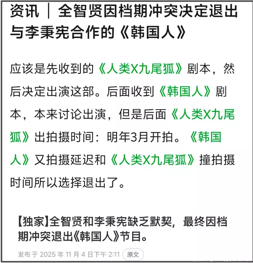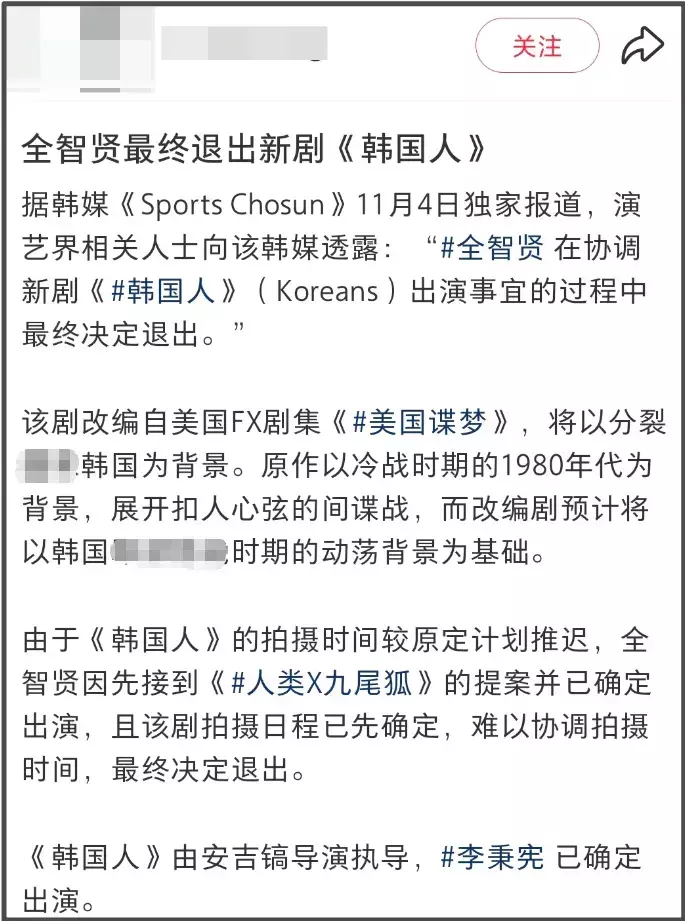 全智贤公司还专门发了声明,解释为什么退出《韩国人》拍摄,韩媒给出的说法是档期冲突,大概时间线是全智贤先后接到了两个剧本邀请,分别是《韩国人》和《人类X九尾狐》。